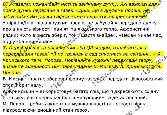 6. У газелях кожен бейт містить закінчену думку. Які важливі для поета думки передано в газелі «Днів, що з друзями провів, не забувай!»? Які рядки Гафіза можна вважати афористичними? У вірші «Днів, що з друзями провів, не забувай!» передано думку про цінність вірності, пам'яті та людського тепла. Афористичні рядки: «Хто вірність зберіг, той і щастя знайде», «Нехай минає час, а дружба не вмирає». 7. Перейшовши за посиланням або QR–кодом, ознайомтеся з перекладами газелі «Я по троянду в сад спустився на світанні...» А. Кримського та М. Попова. Порівняйте художні переклади твору, визначте відмінності між перекладами В. Мисика, А. Кримського, М. Попова. В. Мисик – прагне зберегти форму газелі та передати філософський спокій оригіналу. А. Кримський – використовує багато слів, що підкреслюють східну екзотику, його переклад більш «науковий» та деталізований. М. Попов – робить акцент на музикальності та легкості вірша, підкреслюючи емоційний стан героя.