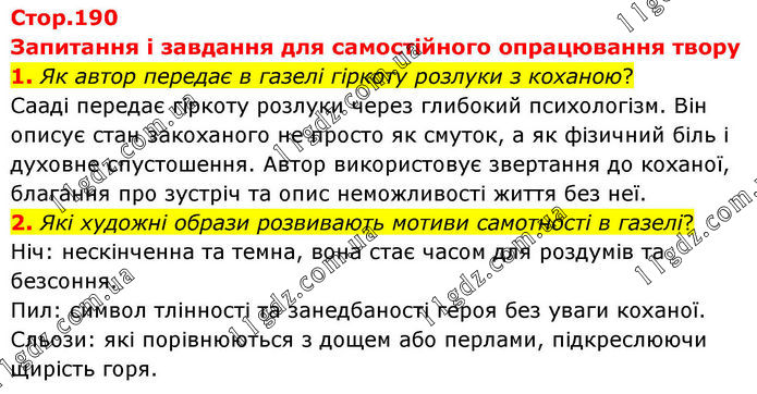 Запитання і завдання для самостійного опрацювання твору 1. Як автор передає в газелі гіркоту розлуки з коханою? Сааді передає гіркоту розлуки через глибокий психологізм. Він описує стан закоханого не просто як смуток, а як фізичний біль і духовне спустошення. Автор використовує звертання до коханої, благання про зустріч та опис неможливості життя без неї. 2. Які художні образи розвивають мотиви самотності в газелі? Ніч: нескінченна та темна, вона стає часом для роздумів та безсоння. Пил: символ тлінності та занедбаності героя без уваги коханої. Сльози: які порівнюються з дощем або перлами, підкреслюючи щирість горя.