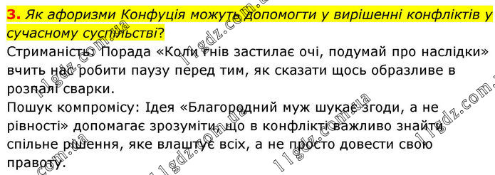 3. Як афоризми Конфуція можуть допомогти у вирішенні конфліктів у сучасному суспільстві? Стриманість: Порада «Коли гнів застилає очі, подумай про наслідки» вчить нас робити паузу перед тим, як сказати щось образливе в розпалі сварки. Пошук компромісу: Ідея «Благородний муж шукає згоди, а не рівності» допомагає зрозуміти, що в конфлікті важливо знайти спільне рішення, яке влаштує всіх, а не просто довести свою правоту.