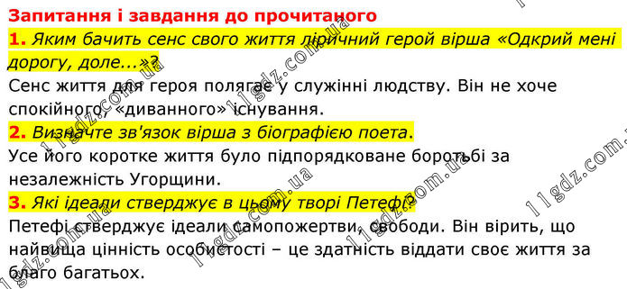 Запитання і завдання до прочитаного 1. Яким бачить сенс свого життя ліричний герой вірша «Одкрий мені дорогу, доле...»? Сенс життя для героя полягає у служінні людству. Він не хоче спокійного, «диванного» існування. 2. Визначте зв'язок вірша з біографією поета. Усе його коротке життя було підпорядковане боротьбі за незалежність Угорщини. 3. Які ідеали стверджує в цьому творі Петефі? Петефі стверджує ідеали самопожертви, свободи. Він вірить, що найвища цінність особистості – це здатність віддати своє життя за благо багатьох.