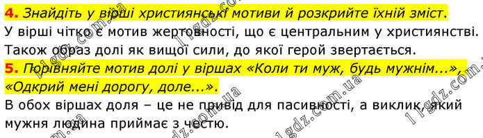 4. Знайдіть у вірші християнські мотиви й розкрийте їхній зміст. У вірші чітко є мотив жертовності, що є центральним у християнстві. Також образ долі як вищої сили, до якої герой звертається. 5. Порівняйте мотив долі у віршах «Коли ти муж, будь мужнім...», «Одкрий мені дорогу, доле...». В обох віршах доля – це не привід для пасивності, а виклик, який мужня людина приймає з честю.