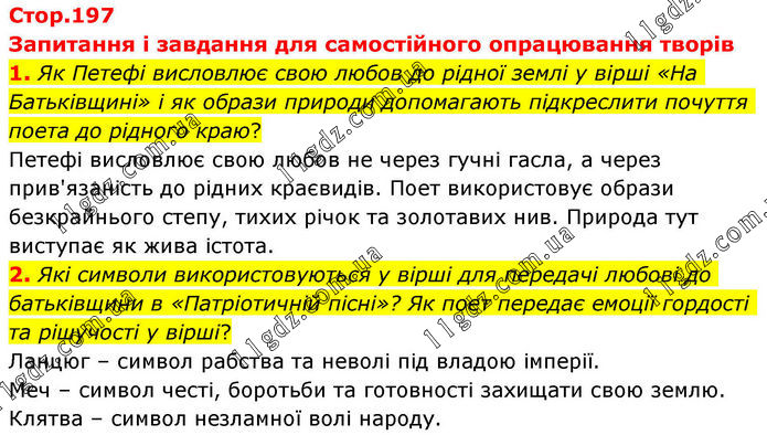 Запитання і завдання для самостійного опрацювання творів 1. Як Петефі висловлює свою любов до рідної землі у вірші «На Батьківщині» і як образи природи допомагають підкреслити почуття поета до рідного краю? Петефі висловлює свою любов не через гучні гасла, а через прив'язаність до рідних краєвидів. Поет використовує образи безкрайнього степу, тихих річок та золотавих нив. Природа тут виступає як жива істота. 2. Які символи використовуються у вірші для передачі любові до батьківщини в «Патріотичній пісні»? Як поет передає емоції гордості та рішучості у вірші? Ланцюг – символ рабства та неволі під владою імперії. Меч – символ честі, боротьби та готовності захищати свою землю. Клятва – символ незламної волі народу.