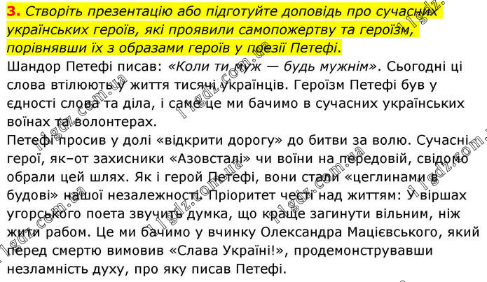 3. Створіть презентацію або підготуйте доповідь про сучасних українських героїв, які проявили самопожертву та героїзм, порівнявши їх з образами героїв у поезії Петефі. Шандор Петефі писав: «Коли ти муж — будь мужнім». Сьогодні ці слова втілюють у життя тисячі українців. Героїзм Петефі був у єдності слова та діла, і саме це ми бачимо в сучасних українських воїнах та волонтерах. Петефі просив у долі «відкрити дорогу» до битви за волю. Сучасні герої, як–от захисники «Азовсталі» чи воїни на передовій, свідомо обрали цей шлях. Як і герой Петефі, вони стали «цеглинами в будові» нашої незалежності. Пріоритет честі над життям: У віршах угорського поета звучить думка, що краще загинути вільним, ніж жити рабом. Це ми бачимо у вчинку Олександра Мацієвського, який перед смертю вимовив «Слава Україні!», продемонструвавши незламність духу, про яку писав Петефі.