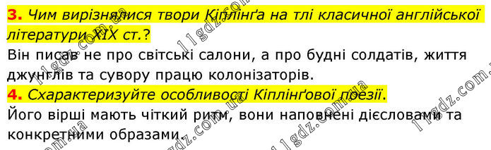 3. Чим вирізнялися твори Кіплінґа на тлі класичної англійської літератури ХІХ ст.? Він писав не про світські салони, а про будні солдатів, життя джунглів та сувору працю колонізаторів. 4. Схарактеризуйте особливості Кіплінґової поезії. Його вірші мають чіткий ритм, вони наповнені дієсловами та конкретними образами.