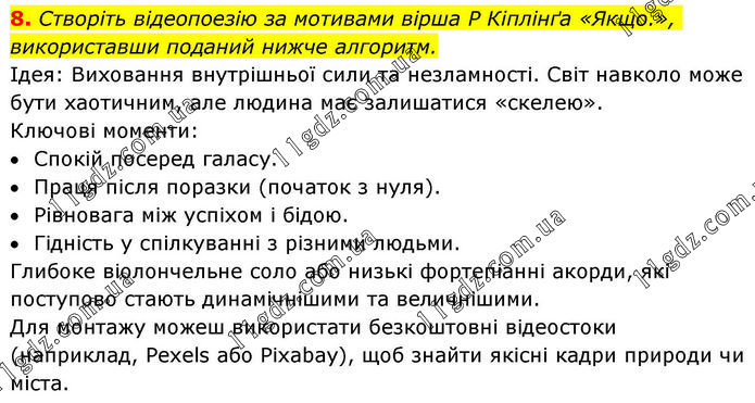 8. Створіть відеопоезію за мотивами вірша Р Кіплінґа «Якщо.», використавши поданий нижче алгоритм. Ідея: Виховання внутрішньої сили та незламності. Світ навколо може бути хаотичним, але людина має залишатися «скелею». Ключові моменти: • Спокій посеред галасу. • Праця після поразки (початок з нуля). • Рівновага між успіхом і бідою. • Гідність у спілкуванні з різними людьми. Глибоке віолончельне соло або низькі фортепіанні акорди, які поступово стають динамічнішими та величнішими. Для монтажу можеш використати безкоштовні відеостоки (наприклад, Pexels або Pixabay), щоб знайти якісні кадри природи чи міста.