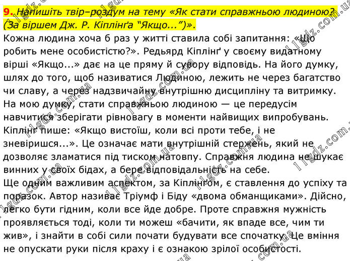 9. Напишіть твір–роздум на тему «Як стати справжньою людиною? (За віршем Дж. Р. Кіплінґа “Якщо...”)». Кожна людина хоча б раз у житті ставила собі запитання: «Що робить мене особистістю?». Редьярд Кіплінґ у своєму видатному вірші «Якщо...» дає на це пряму й сувору відповідь. На його думку, шлях до того, щоб називатися Людиною, лежить не через багатство чи славу, а через надзвичайну внутрішню дисципліну та витримку. На мою думку, стати справжньою людиною — це передусім навчитися зберігати рівновагу в моменти найвищих випробувань. Кіплінґ пише: «Якщо вистоїш, коли всі проти тебе, і не зневіришся...». Це означає мати внутрішній стержень, який не дозволяє зламатися під тиском натовпу. Справжня людина не шукає винних у своїх бідах, а бере відповідальність на себе. Ще одним важливим аспектом, за Кіплінґом, є ставлення до успіху та поразок. Автор називає Тріумф і Біду «двома обманщиками». Дійсно, легко бути гідним, коли все йде добре. Проте справжня мужність проявляється тоді, коли ти можеш «бачити, як впаде все, чим ти жив», і знайти в собі сили почати будувати все спочатку. Це вміння не опускати руки після краху і є ознакою зрілої особистості.