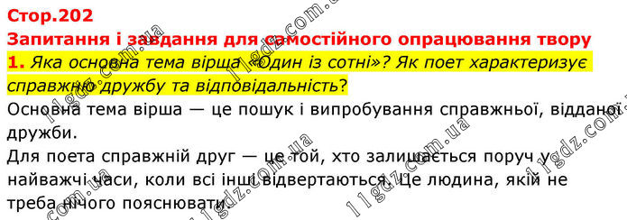 Запитання і завдання для самостійного опрацювання твору 1. Яка основна тема вірша «Один із сотні»? Як поет характеризує справжню дружбу та відповідальність? Основна тема вірша — це пошук і випробування справжньої, відданої дружби. Для поета справжній друг — це той, хто залишається поруч у найважчі часи, коли всі інші відвертаються. Це людина, якій не треба нічого пояснювати.
