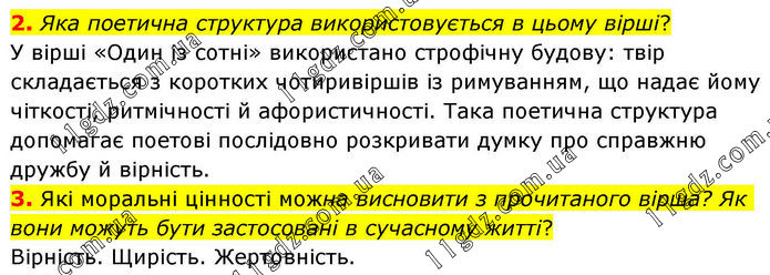 2. Яка поетична структура використовується в цьому вірші? У вірші «Один із сотні» використано строфічну будову: твір складається з коротких чотиривіршів із римуванням, що надає йому чіткості, ритмічності й афористичності. Така поетична структура допомагає поетові послідовно розкривати думку про справжню дружбу й вірність. 3. Які моральні цінності можна висновити з прочитаного вірша? Як вони можуть бути застосовані в сучасному житті? Вірність. Щирість. Жертовність.