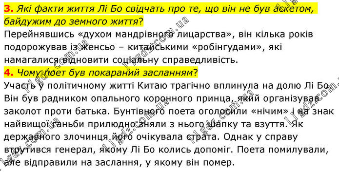 3. Які факти життя Лі Бо свідчать про те, що він не був аскетом, байдужим до земного життя? Перейнявшись «духом мандрівного лицарства», він кілька років подорожував із женсьо – китайськими «робінгудами», які намагалися відновити соціальну справедливість. 4. Чому поет був покараний засланням? Участь у політичному житті Китаю трагічно вплинула на долю Лі Бо. Він був радником опального коронного принца, який організував заколот проти батька. Бунтівного поета оголосили «нічим» і на знак найвищої ганьби прилюдно зняли з нього шапку та взуття. Як державного злочинця його очікувала страта. Однак у справу втрутився генерал, якому Лі Бо колись допоміг. Поета помилували, але відправили на заслання, у якому він помер.