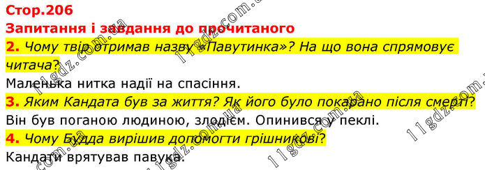 Запитання і завдання до прочитаного 2. Чому твір отримав назву «Павутинка»? На що вона спрямовує читача? Маленька нитка надії на спасіння. 3. Яким Кандата був за життя? Як його було покарано після смерті? Він був поганою людиною, злодієм. Опинився у пеклі. 4. Чому Будда вирішив допомогти грішникові? Кандати врятував павука.