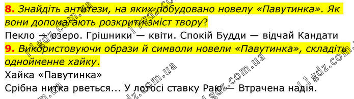 8. Знайдіть антитези, на яких побудовано новелу «Павутинка». Як вони допомагають розкрити зміст твору? Пекло — озеро. Грішники — квіти. Спокій Будди — відчай Кандати 9. Використовуючи образи й символи новели «Павутинка», складіть однойменне хайку. Хайка «Павутинка» Срібна нитка рветься... У лотосі ставку Раю — Втрачена надія.
