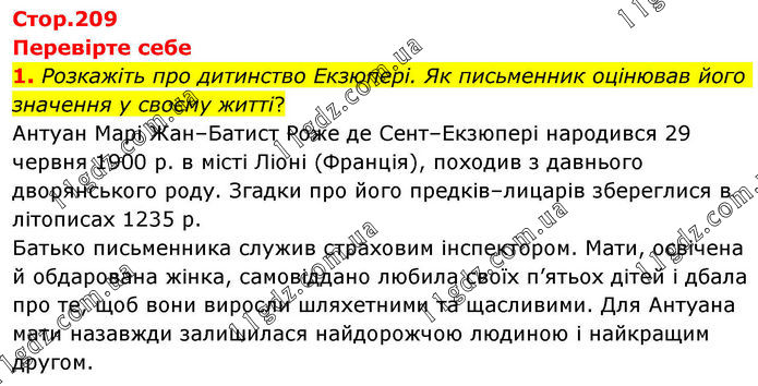 Перевірте себе 1. Розкажіть про дитинство Екзюпері. Як письменник оцінював його значення у своєму житті? Антуан Марі Жан–Батист Роже де Сент–Екзюпері народився 29 червня 1900 р. в місті Ліоні (Франція), походив з давнього дворянського роду. Згадки про його предків–лицарів збереглися в літописах 1235 р. Батько письменника служив страховим інспектором. Мати, освічена й обдарована жінка, самовіддано любила своїх п’ятьох дітей і дбала про те, щоб вони виросли шляхетними та щасливими. Для Антуана мати назавжди залишилася найдорожчою людиною і найкращим другом.