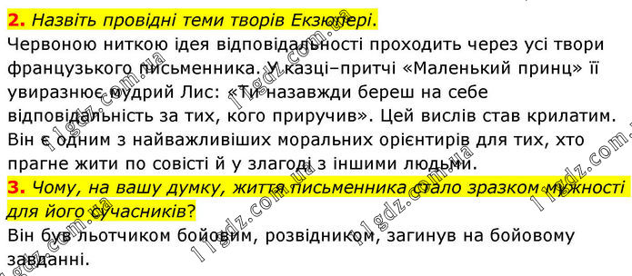 2. Назвіть провідні теми творів Екзюпері. Червоною ниткою ідея відповідальності проходить через усі твори французького письменника. У казці–притчі «Маленький принц» її увиразнює мудрий Лис: «Ти назавжди береш на себе відповідальність за тих, кого приручив». Цей вислів став крилатим. Він є одним з найважливіших моральних орієнтирів для тих, хто прагне жити по совісті й у злагоді з іншими людьми. 3. Чому, на вашу думку, життя письменника стало зразком мужності для його сучасників? Він був льотчиком бойовим, розвідником, загинув на бойовому завданні.