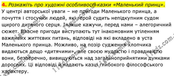 4. Розкажіть про художні особливості казки «Маленький принц». У центрі авторської уваги – не пригоди Маленького принца, а почуття і стосунки людей, які герой судить непідкупним судом щирого дитячого серця. Інакше кажучи, перед нами – алегоричний сюжет. Власне пригоди виступають тут інакомовним утіленням важливих життєвих питань, відповіді на які вкладено в уста Маленького принца. Можливо, на позір судження хлопчика видаються дещо «дитячими», але своєю мудрістю і правдивістю вони, безперечно, вивищуються над загальноприйнятими думками дорослих. Ці відповіді й надають казці глибокого філософського характеру.