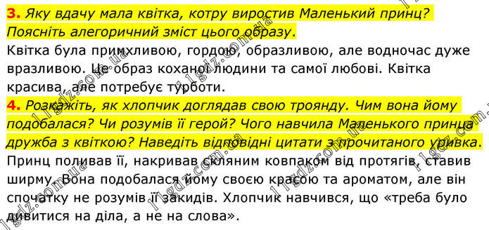 3. Яку вдачу мала квітка, котру виростив Маленький принц? Поясніть алегоричний зміст цього образу. Квітка була примхливою, гордою, образливою, але водночас дуже вразливою. Це образ коханої людини та самої любові. Квітка красива, але потребує турботи. 4. Розкажіть, як хлопчик доглядав свою троянду. Чим вона йому подобалася? Чи розумів її герой? Чого навчила Маленького принца дружба з квіткою? Наведіть відповідні цитати з прочитаного уривка. Принц поливав її, накривав скляним ковпаком від протягів, ставив ширму. Вона подобалася йому своєю красою та ароматом, але він спочатку не розумів її закидів. Хлопчик навчився, що «треба було дивитися на діла, а не на слова».