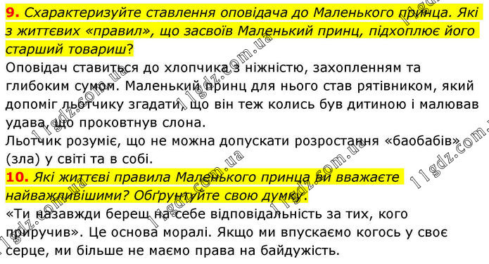 9. Схарактеризуйте ставлення оповідача до Маленького принца. Які з життєвих «правил», що засвоїв Маленький принц, підхоплює його старший товариш? Оповідач ставиться до хлопчика з ніжністю, захопленням та глибоким сумом. Маленький принц для нього став рятівником, який допоміг льотчику згадати, що він теж колись був дитиною і малював удава, що проковтнув слона. Льотчик розуміє, що не можна допускати розростання «баобабів» (зла) у світі та в собі. 10. Які життєві правила Маленького принца ви вважаєте найважливішими? Обґрунтуйте свою думку. «Ти назавжди береш на себе відповідальність за тих, кого приручив». Це основа моралі. Якщо ми впускаємо когось у своє серце, ми більше не маємо права на байдужість.
