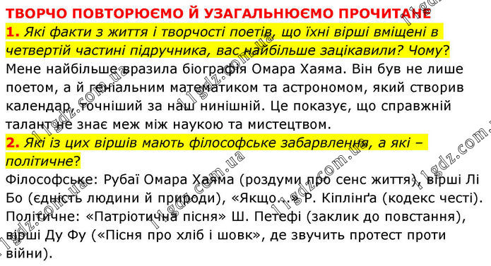 ТВОРЧО ПОВТОРЮЄМО Й УЗАГАЛЬНЮЄМО ПРОЧИТАНЕ 1. Які факти з життя і творчості поетів, що їхні вірші вміщені в четвертій частині підручника, вас найбільше зацікавили? Чому? Мене найбільше вразила біографія Омара Хаяма. Він був не лише поетом, а й геніальним математиком та астрономом, який створив календар, точніший за наш нинішній. Це показує, що справжній талант не знає меж між наукою та мистецтвом. 2. Які із цих віршів мають філософське забарвлення, а які – політичне? Філософське: Рубаї Омара Хаяма (роздуми про сенс життя), вірші Лі Бо (єдність людини й природи), «Якщо...» Р. Кіплінґа (кодекс честі). Політичне: «Патріотична пісня» Ш. Петефі (заклик до повстання), вірші Ду Фу («Пісня про хліб і шовк», де звучить протест проти війни).
