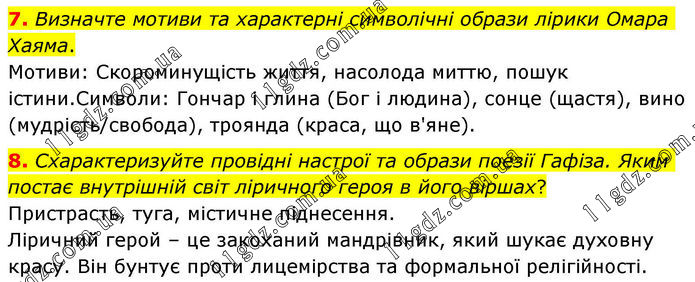 7. Визначте мотиви та характерні символічні образи лірики Омара Хаяма. Мотиви: Скороминущість життя, насолода миттю, пошук істини. Символи: Гончар і глина (Бог і людина), сонце (щастя), вино (мудрість/свобода), троянда (краса, що в'яне). 8. Схарактеризуйте провідні настрої та образи поезії Гафіза. Яким постає внутрішній світ ліричного героя в його віршах? Пристрасть, туга, містичне піднесення. Ліричний герой – це закоханий мандрівник, який шукає духовну красу. Він бунтує проти лицемірства та формальної релігійності.