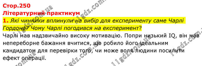 Літературний практикум 1. Які чинники вплинули на вибір для експерименту саме Чарлі Гордона? Чому Чарлі погодився на експеримент? Чарлі мав надзвичайно високу мотивацію. Попри низький IQ, він мав непереборне бажання вчитися, що робило його ідеальним кандидатом для перевірки того, чи може воля людини посилити ефект операції.