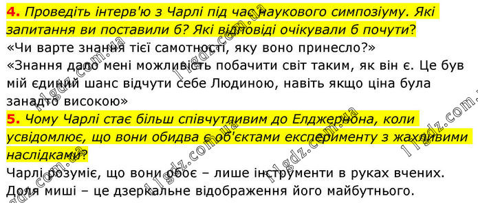 4. Проведіть інтерв'ю з Чарлі під час наукового симпозіуму. Які запитання ви поставили б? Які відповіді очікували б почути? «Чи варте знання тієї самотності, яку воно принесло?» «Знання дало мені можливість побачити світ таким, як він є. Це був мій єдиний шанс відчути себе Людиною, навіть якщо ціна була занадто високою» 5. Чому Чарлі стає більш співчутливим до Елджернона, коли усвідомлює, що вони обидва є об'єктами експерименту з жахливими наслідками? Чарлі розуміє, що вони обоє – лише інструменти в руках вчених. Доля миші – це дзеркальне відображення його майбутнього.