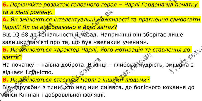 6. Порівняйте розвиток головного героя – Чарлі Гордона на початку та в кінці роману. А. Як змінюються інтелектуальні можливості та прагнення самоосвіти Чарлі? Як це відображено в його звітах? Від IQ 68 до геніальності й назад. Наприкінці він зберігає лише залишки пам'яті про те, що був «великим ученим». Б. Як змінюються характер Чарлі, його мотивація та ставлення до життя? На початку – наївна доброта. В кінці – глибока мудрість, змішана з відчаєм і гідністю. В. Як змінюються стосунки Чарлі з іншими людьми? Від «дружби» з тими, хто над ним сміявся, до болісного кохання до Аліси Кінніан і добровільної ізоляції.
