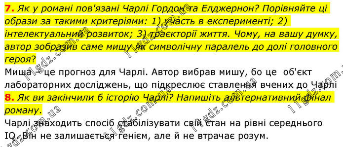7. Як у романі пов'язані Чарлі Гордон та Елджернон? Порівняйте ці образи за такими критеріями: 1) участь в експерименті; 2) інтелектуальний розвиток; 3) траєкторії життя. Чому, на вашу думку, автор зобразив саме мишу як символічну паралель до долі головного героя? Миша – це прогноз для Чарлі. Автор вибрав мишу, бо це об'єкт лабораторних досліджень, що підкреслює ставлення вчених до Чарлі 8. Як ви закінчили б історію Чарлі? Напишіть альтернативний фінал роману. Чарлі знаходить спосіб стабілізувати свій стан на рівні середнього IQ. Він не залишається генієм, але й не втрачає розум.