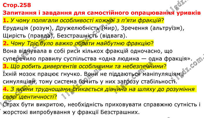 Запитання і завдання для самостійного опрацювання уривків 1. У чому полягали особливості кожної з п'яти фракцій? Ерудиція (розум), Дружелюбність (мир), Зречення (альтруїзм), Щирість (правда), Безстрашність (відвага). 2. Чому Тріс було важко обрати майбутню фракцію? Вона відчувала в собі риси кількох фракцій одночасно, що суперечило правилу суспільства «одна людина — одна фракція». 3. Що робить дивергентів особливими та небезпечними? Їхній мозок працює гнучко. Вони не піддаються маніпуляціям і симуляціям, тому система бачить у них загрозу стабільності. 4. З якими труднощами стикається дівчина на шляху до розуміння своєї ідентичності? Страх бути викритою, необхідність приховувати справжню сутність і жорстокі випробування у фракції Безстрашних.