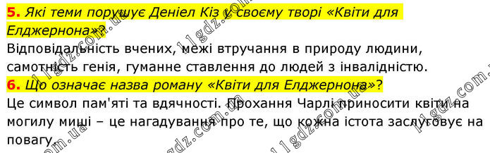 5. Які теми порушує Деніел Кіз у своєму творі «Квіти для Елджернона»? Відповідальність вчених, межі втручання в природу людини, самотність генія, гуманне ставлення до людей з інвалідністю. 6. Що означає назва роману «Квіти для Елджернона»? Це символ пам'яті та вдячності. Прохання Чарлі приносити квіти на могилу миші – це нагадування про те, що кожна істота заслуговує на повагу.