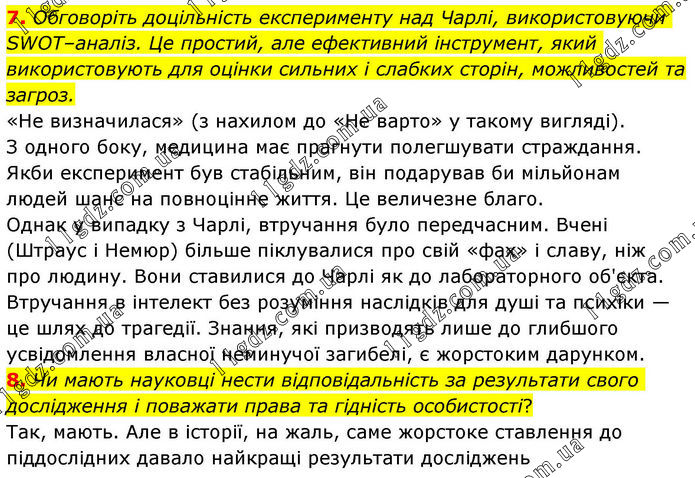 7. Обговоріть доцільність експерименту над Чарлі, використовуючи SWOT–аналіз. Це простий, але ефективний інструмент, який використовують для оцінки сильних і слабких сторін, можливостей та загроз. «Не визначилася» (з нахилом до «Не варто» у такому вигляді). З одного боку, медицина має прагнути полегшувати страждання. Якби експеримент був стабільним, він подарував би мільйонам людей шанс на повноцінне життя. Це величезне благо. Однак у випадку з Чарлі, втручання було передчасним. Вчені (Штраус і Немюр) більше піклувалися про свій «фах» і славу, ніж про людину. Вони ставилися до Чарлі як до лабораторного об'єкта. Втручання в інтелект без розуміння наслідків для душі та психіки — це шлях до трагедії. Знання, які призводять лише до глибшого усвідомлення власної неминучої загибелі, є жорстоким дарунком. 8. Чи мають науковці нести відповідальність за результати свого дослідження і поважати права та гідність особистості? Так, мають. Але в історії, на жаль, саме жорстоке ставлення до піддослідних давало найкращі результати досліджень.