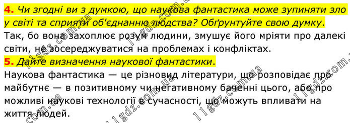 4. Чи згодні ви з думкою, що наукова фантастика може зупиняти зло у світі та сприяти об'єднанню людства? Обґрунтуйте свою думку. Так, бо вона захоплює розум людини, змушує його мріяти про далекі світи, не зосереджуватися на проблемах і конфліктах. 5. Дайте визначення наукової фантастики. Наукова фантастика — це різновид літератури, що розповідає про майбутнє — в позитивному чи негативному баченні цього, або про можливі наукові технології в сучасності, що можуть впливати на життя людей.