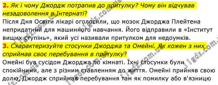 2. Як і чому Джордж потрапив до притулку? Чому він відчував незадоволення в Інтернаті? Після Дня Освіти лікарі оголосили, що мозок Джорджа Плейтена непридатний для машинного навчання. Його відправили в «Інститут вищих ступінь», який усі називали притулком для недоумків. 3. Схарактеризуйте стосунки Джорджа та Омейні. Як кожен з них сприймав своє перебування в притулку? Омейні був сусідом Джорджа по кімнаті. Їхні стосунки були спокійними, але з різним ставленням до життя. Омейні прийняв свою долю, Джордж сприймав перебування там як помилку або в'язницю.