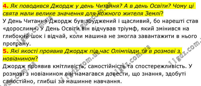 4. Як поводився Джордж у день Читання? А в день Освіти? Чому ці свята мали велике значення для кожного жителя Землі? У День Читання Джордж був збуджений і щасливий, бо нарешті став «дорослим». У День Освіти він відчував тріумф, який змінився на глибокий шок і відчай, коли машина не змогла завантажити в нього програму. 5. Які якості проявив Джордж під час Олімпіади та в розмові з новіанином? Джордж проявив кмітливість, самостійність та спостережливість. У розмові з новіанином він намагався довести, що знання, здобуті самостійно, глибші за машинне навчання.