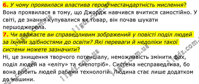 6. У чому проявилася властива герою нестандартність мислення? Вона проявилася в тому, що Джордж навчився вчитися самостійно. У світі, де знання купувалися як товар, він почав шукати першоджерела. 7. Чи вважаєте ви справедливим зображений у повісті поділ людей за їхніми здібностями до освіти? Які переваги й недоліки такої системи можете зазначити? Ні, це знищення творчого потенціалу, неможливість змінити фах, поділ людей на «еліту» та «непотріб». Система несправедлива, бо вона робить людей рабами технологій. Людина стає лише додатком до машини.