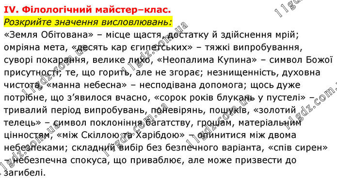 IV. Філологічний майстер–клас. Розкрийте значення висловлювань: «Земля Обітована» – місце щастя, достатку й здійснення мрій; омріяна мета, «десять кар єгипетських» – тяжкі випробування, суворі покарання, велике лихо, «Неопалима Купина» – символ Божої присутності; те, що горить, але не згорає; незнищенність, духовна чистота, «манна небесна» – несподівана допомога; щось дуже потрібне, що з’явилося вчасно, «сорок років блукань у пустелі» – тривалий період випробувань, поневірянь, пошуків, «золотий телець» – символ поклоніння багатству, грошам, матеріальним цінностям, «між Скіллою та Харібдою» – опинитися між двома небезпеками; складний вибір без безпечного варіанта, «спів сирен» – небезпечна спокуса, що приваблює, але може призвести до загибелі.