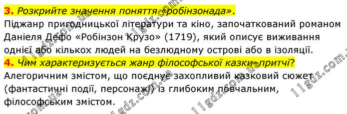 3. Розкрийте значення поняття «робінзонада». Піджанр пригодницької літератури та кіно, започаткований романом Даніеля Дефо «Робінзон Крузо» (1719), який описує виживання однієї або кількох людей на безлюдному острові або в ізоляції. 4. Чим характеризується жанр філософської казки–притчі? Алегоричним змістом, що поєднує захопливий казковий сюжет (фантастичні події, персонажі) із глибоким повчальним, філософським змістом.