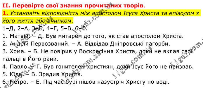 ІІ. Перевірте свої знання прочитаних творів. 1. Установіть відповідність між апостолом Ісуса Христа та епізодом з його життя або вчинком. 1–Д, 2–А, 3–Б, 4–Г, 5–В, 6–Е. 1. Матвій. – Д. Був митарем до того, як став апостолом Христа. 2. Андрій Первозваний. – А. Відвідав Дніпровські пагорби. 3. Хома. – Б. Не повірив у Воскресіння Христа, доки не вклав свої пальці в Його рани. 4. Павло. – Г. Був гонителем християн, доки Ісус його не призвав. 5. Юда. – В. Зрадив Христа. 6. Петро. – Е. Під час бурі пішов назустріч Христу по воді.