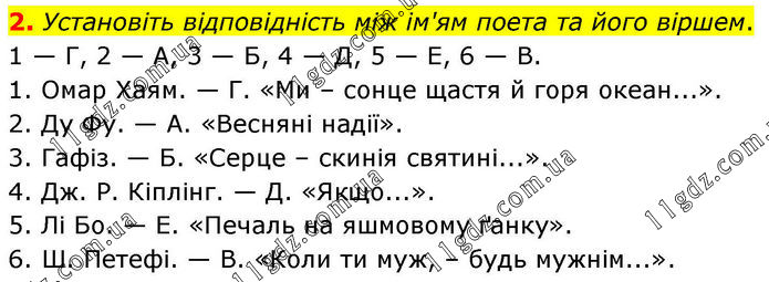 2. Установіть відповідність між ім'ям поета та його віршем. 1 — Г, 2 — А, 3 — Б, 4 — Д, 5 — Е, 6 — В. 1. Омар Хаям. — Г. «Ми – сонце щастя й горя океан...». 2. Ду Фу. — А. «Весняні надії». 3. Гафіз. — Б. «Серце – скинія святині...». 4. Дж. Р. Кіплінг. — Д. «Якщо...». 5. Лі Бо. — Е. «Печаль на яшмовому ґанку». 6. Ш. Петефі. — В. «Коли ти муж, – будь мужнім...».