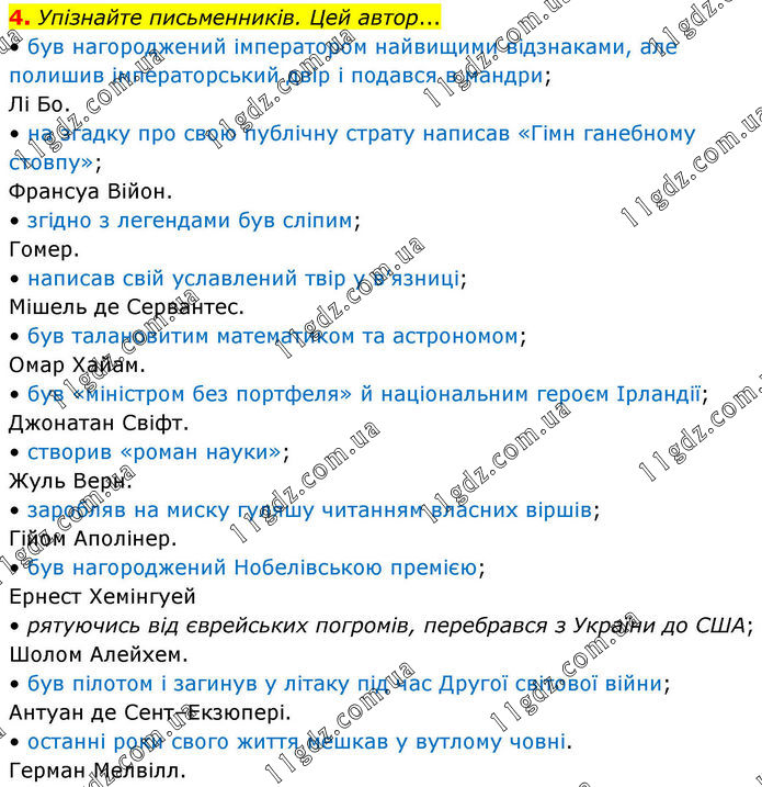 4. Упізнайте письменників. Цей автор... • був нагороджений імператором найвищими відзнаками, але полишив імператорський двір і подався в мандри; Лі Бо. • на згадку про свою публічну страту написав «Гімн ганебному стовпу»; Франсуа Війон. • згідно з легендами був сліпим; Гомер. • написав свій уславлений твір у в’язниці; Мішель де Сервантес. • був талановитим математиком та астрономом; Омар Хайам. • був «міністром без портфеля» й національним героєм Ірландії; Джонатан Свіфт. • створив «роман науки»; Жуль Верн. • заробляв на миску гуляшу читанням власних віршів; Гійом Аполінер. • був нагороджений Нобелівською премією; Ернест Хемінгуей • рятуючись від єврейських погромів, перебрався з України до США; Шолом Алейхем. • був пілотом і загинув у літаку під час Другої світової війни; Антуан де Сент–Екзюпері. • останні роки свого життя мешкав у вутлому човні. Герман Мелвілл.