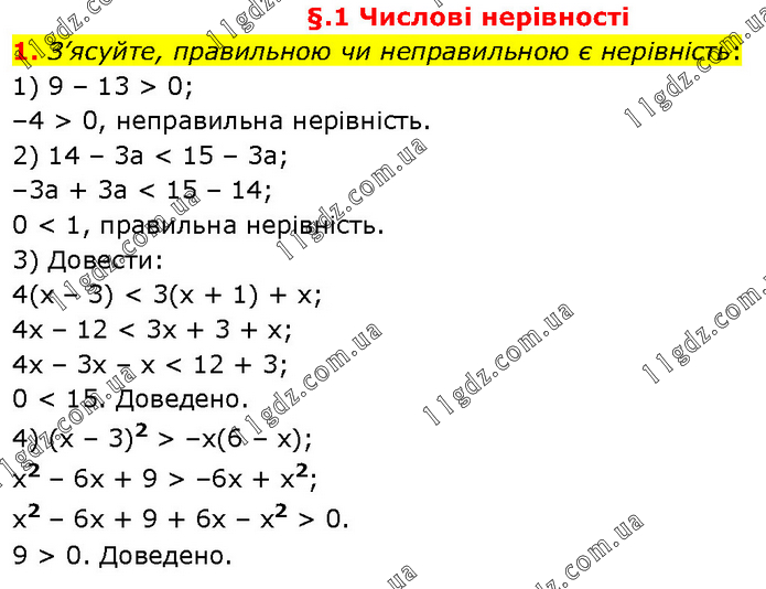 §.1 Числові нерівності 1. З’ясуйте, правильною чи неправильною є нерівність: 1) 9 – 13 > 0; –4 > 0, неправильна нерівність. 2) 14 – 3а < 15 – 3a; –3a + 3a < 15 – 14; 0 < 1, правильна нерівність. 3) Довести: 4(х – 3) < 3(x + 1) + x; 4x – 12 < 3x + 3 + x; 4x – 3x – x < 12 + 3; 0 < 15. Доведено. 4) (x – 3)2 > –x(6 – x); x2 – 6x + 9 > –6x + x2; x2 – 6x + 9 + 6x – x2 > 0. 9 > 0. Доведено.