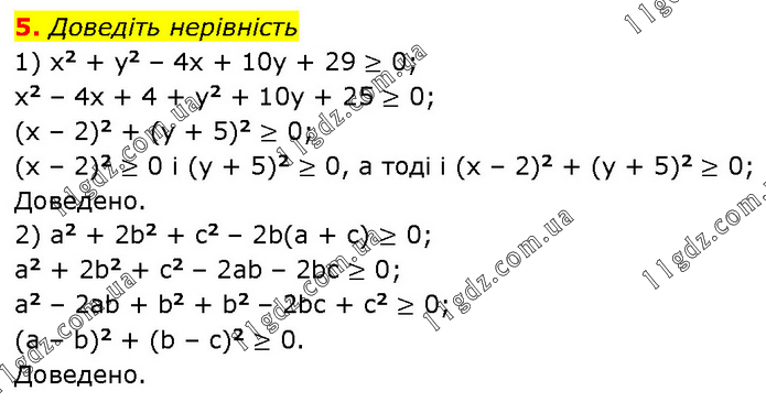 Доведіть нерівність 1) х2 + у2 – 4х + 10у + 29 ≥ 0; х2 – 4х + 4 + у2 + 10у + 25 ≥ 0; (х – 2)2 + (у + 5)2 ≥ 0; (х – 2)2 ≥ 0 і (у + 5)2 ≥ 0, а тоді і (х – 2)2 + (у + 5)2 ≥ 0; Доведено. 2) а2 + 2b2 + c2 – 2b(a + c) ≥ 0; a2 + 2b2 + c2 – 2ab – 2bc ≥ 0; a2 – 2ab + b2 + b2 – 2bc + c2 ≥ 0; (a – b)2 + (b – c)2 ≥ 0. Доведено.
