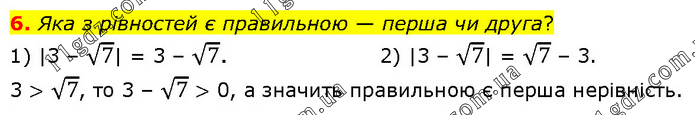 Яка з рівностей є правильною — перша чи друга? 1) |3 – √7| = 3 – √7. 2) |3 – √7| = √7 – 3. 3 > √7, то 3 – √7 > 0, а значить правильною є перша нерівність.