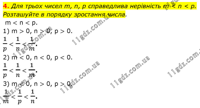 Для трьох чисел m, n, p справедлива нерівність m < n < p. Розташуйте в порядку зростання числа. m < n < p. 1) m > 0, n > 0, p > 0. 1/p < 1/n < 1/m. 2) m < 0, n < 0, p < 0. 1/p < 1/n < 1/m. 3) m < 0, n > 0, p > 0. 1/m < 1/p < 1/n.