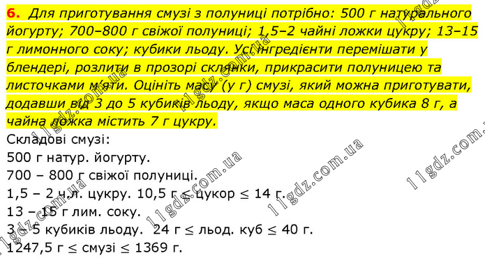 Для приготування смузі з полуниці потрібно: 500 г натурального йогурту; 700–800 г свіжої полуниці; 1,5–2 чайні ложки цукру; 13–15 г лимонного соку; кубики льоду. Усі інгредієнти перемішати у блендері, розлити в прозорі склянки, прикрасити полуницею та листочками м’яти. Оцініть масу (у г) смузі, який можна приготувати, додавши від 3 до 5 кубиків льоду, якщо маса одного кубика 8 г, а чайна ложка містить 7 г цукру. Складові смузі: 500 г натур. йогурту. 700 – 800 г свіжої полуниці. 1,5 – 2 ч.л. цукру. 10,5 г ≤ цукор ≤ 14 г. 13 – 15 г лим. соку. 3 – 5 кубиків льоду. 24 г ≤ льод. куб ≤ 40 г. 1247,5 г ≤ смузі ≤ 1369 г.