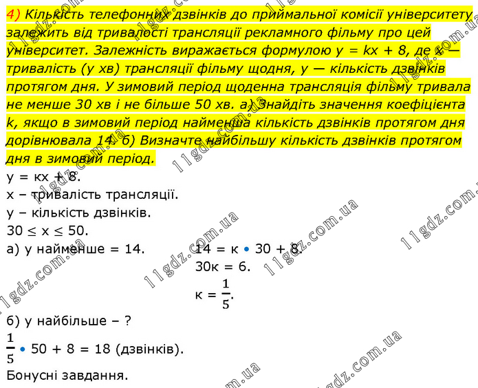 Кількість телефонних дзвінків до приймальної комісії університету залежить від тривалості трансляції рекламного фільму про цей університет. Залежність виражається формулою y = kx + 8, де x — тривалість (у хв) трансляції фільму щодня, y — кількість дзвінків протягом дня. У зимовий період щоденна трансляція фільму тривала не менше 30 хв і не більше 50 хв. а) Знайдіть значення коефіцієнта k, якщо в зимовий період найменша кількість дзвінків протягом дня дорівнювала 14. б) Визначте найбільшу кількість дзвінків протягом дня в зимовий період. у = кх + 8. х – тривалість трансляції. у – кількість дзвінків. 30 ≤ х ≤ 50. а) у найменше = 14. 14 = к • 30 + 8. 30к = 6. к = 1/5. б) у найбільше – ? 1/5 • 50 + 8 = 18 (дзвінків). Бонусні завдання.