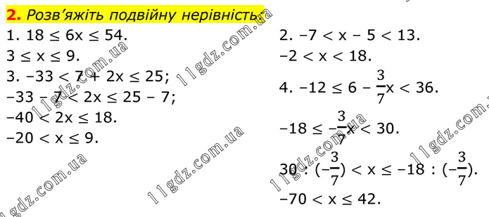 Розв’яжіть подвійну нерівність: 1. 18 ≤ 6х ≤ 54. 3 ≤ х ≤ 9. 2. –7 < х – 5 < 13. –2 < х < 18. 3. –33 < 7 + 2х ≤ 25; –33 – 7 < 2x ≤ 25 – 7; –40 < 2x ≤ 18. –20 < x ≤ 9. 4. –12 ≤ 6 – 3/7x < 36. –18 ≤ –3/7x < 30. 30 : (–3/7) < x ≤ –18 : (–3/7). –70 < x ≤ 42.