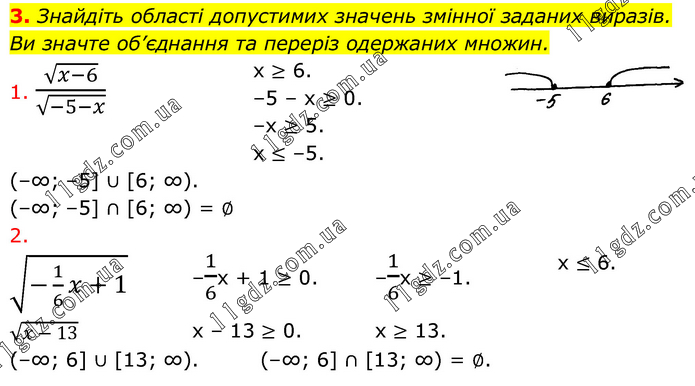 Знайдіть області допустимих значень змінної заданих виразів. Ви значте об’єднання та переріз одержаних множин. 1. √(x-6)/√(-5-x) x ≥ 6. –5 – x ≥ 0. –x ≥ 5. x ≤ –5. (–∞; –5] ∪ [6; ∞). (–∞; –5] ∩ [6; ∞) = ∅ 2. √(-1/6 x+1) –1/6x + 1 ≥ 0. –1/6x ≥ –1. x ≤ 6. √(x-13) x – 13 ≥ 0. x ≥ 13. (–∞; 6] ∪ [13; ∞). (–∞; 6] ∩ [13; ∞) = ∅.