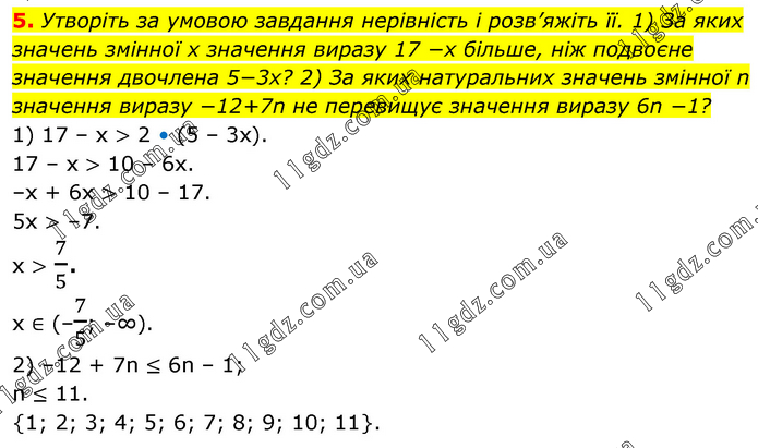 Утворіть за умовою завдання нерівність і розв’яжіть її. 1) За яких значень змінної x значення виразу 17 −x більше, ніж подвоєне значення двочлена 5−3x? 2) За яких натуральних значень змінної n значення виразу −12+7n не перевищує значення виразу 6n −1? 1) 17 – х > 2 • (5 – 3х). 17 – х > 10 – 6х. –х + 6х > 10 – 17. 5х > –7. х > 7/5. х ∈ (–7/5; –∞). 2) –12 + 7n ≤ 6n – 1; n ≤ 11. {1; 2; 3; 4; 5; 6; 7; 8; 9; 10; 11}.