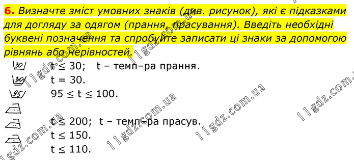Визначте зміст умовних знаків (див. рисунок), які є підказками для догляду за одягом (прання, прасування). Введіть необхідні буквені позначення та спробуйте записати ці знаки за допомогою рівнянь або нерівностей. t ≤ 30; t – темп–ра прання. t = 30. 95 ≤ t ≤ 100. t ≤ 200; t – темп–ра прасув. t ≤ 150. t ≤ 110.