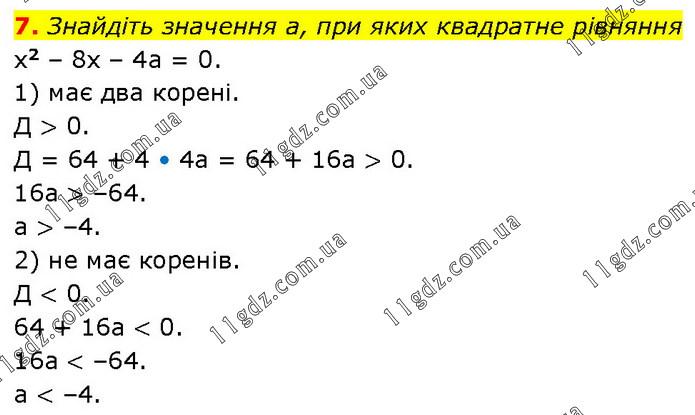 Знайдіть значення a, при яких квадратне рівняння x2 – 8x – 4a = 0. 1) має два корені. Д > 0. Д = 64 + 4 • 4а = 64 + 16а > 0. 16а > –64. а > –4. 2) не має коренів. Д < 0. 64 + 16а < 0. 16а < –64. а < –4.