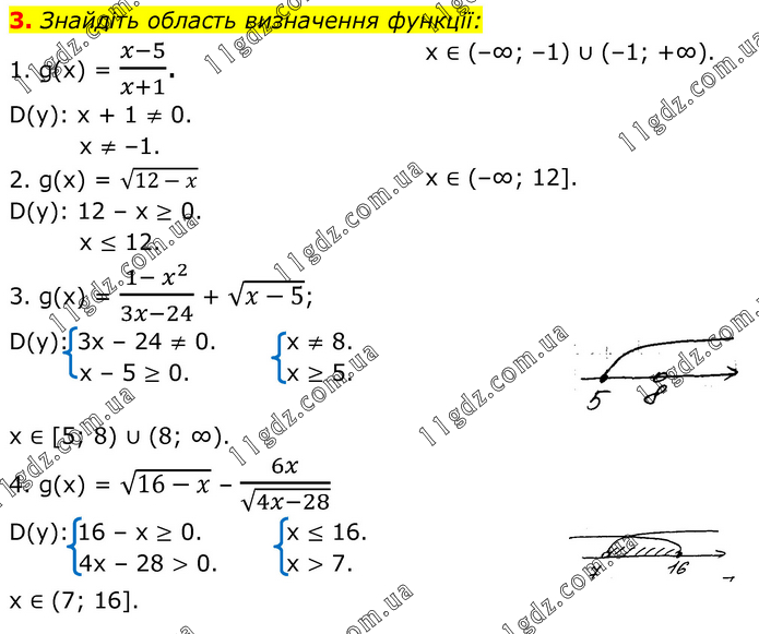 Знайдіть область визначення функції: 1. g(x) = (x-5)/(x+1). D(y): x + 1 ≠ 0. x ≠ –1. x ∈ (–∞; –1) ∪ (–1; +∞). 2. g(x) = √(12-x) D(y): 12 – x ≥ 0. x ≤ 12. x ∈ (–∞; 12]. 3. g(x) = (1- x^2)/(3x-24) + √(x-5); D(y): 3x – 24 ≠ 0. x – 5 ≥ 0. x ≠ 8. x ≥ 5. x ∈ [5; 8) ∪ (8; ∞). 4. g(x) = √(16-x) – 6x/√(4x-28) D(y): 16 – x ≥ 0. 4x – 28 > 0. x ≤ 16. x > 7. x ∈ (7; 16].